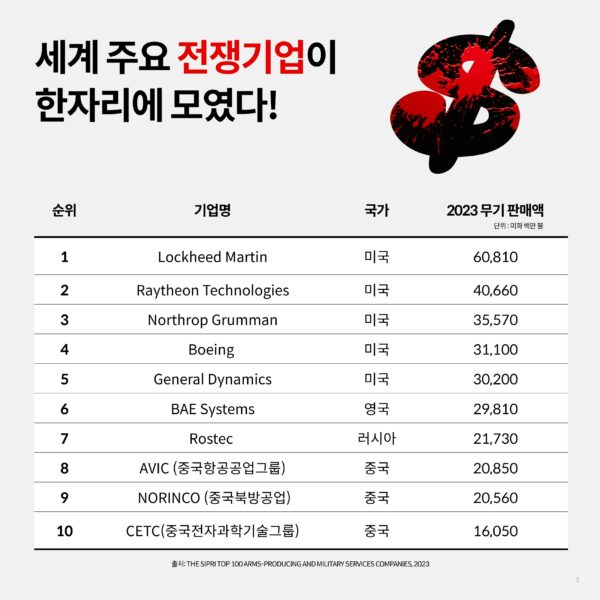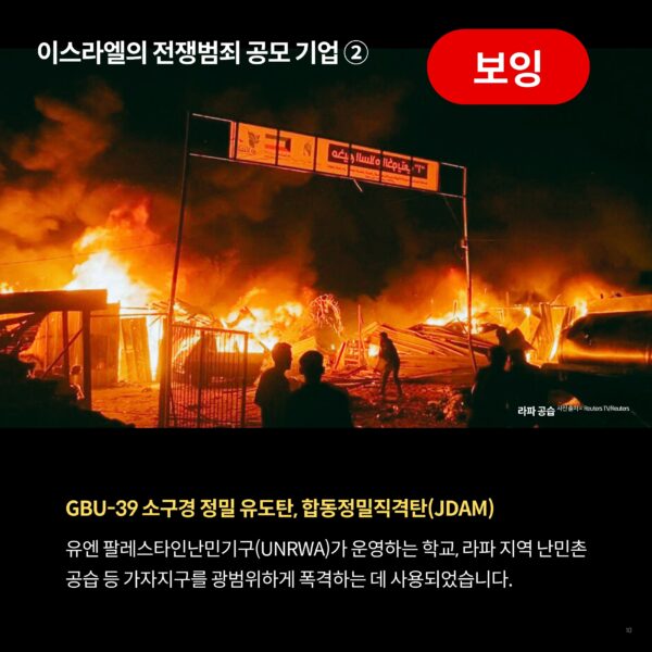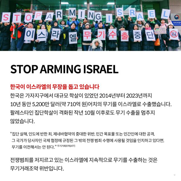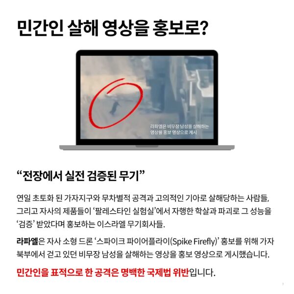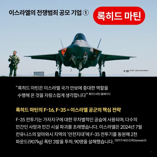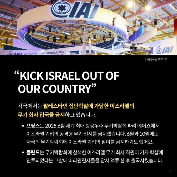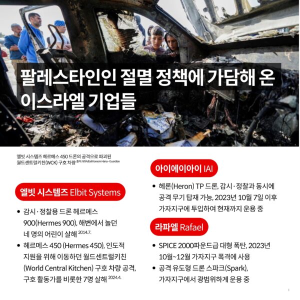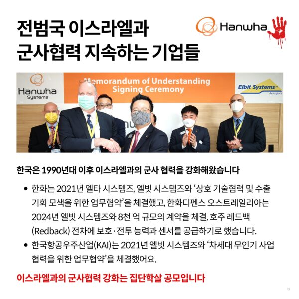 KAI는 이스라엘의 팔레스타인 집단학살에 적극적으로 공모해온 이스라엘 무기 회사 엘빗 시스템즈, IAI 등과 배회탄(자폭형 무인기) 프로그램 개발 등에 관한 MOU를 맺었습니다.