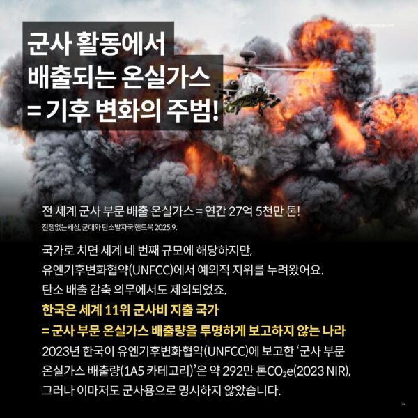 현대로템은 수소연료전지 장갑차도 개발하고 있는 것으로 알려졌습니다. 이는 대표적인 무기산업의 그린워싱 사례입니다. 세계적으로 저탄소/무탄소 무기체계가 많이 개발되고 있으나, 무기의 개발 및 생산, 사용과 파괴로 인한 인프라 재건에서 발생하는 온실가스를 생각하면 ‘친환경 무기’는 어불성설입니다.