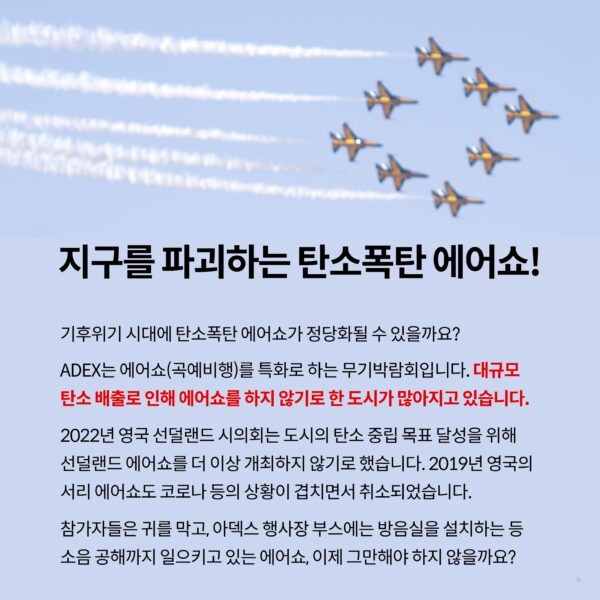 그러나 올해 ADEX의 경우 17~19일 퍼블릭데이는 성남 서울공항에서 야외 전시와 체험, 에어쇼를 중심으로, 20~24일 비즈니스데이는 일산 킨텍스에서 기업 부스를 중심으로 분리해서 개최됩니다.